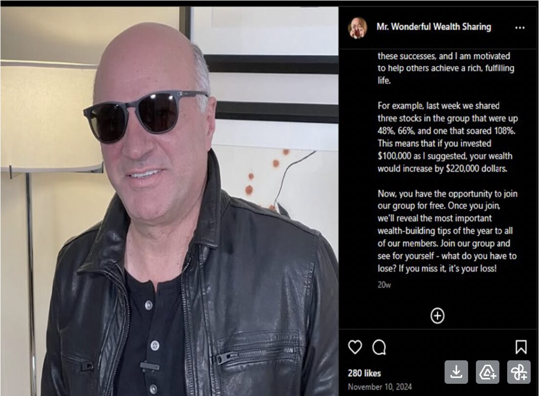 - The Bait: Scam ads appear on Facebook or Instagram featuring recognizable figures, like Cathie Wood (Ark Invest), Joe Kernen (CNBC), or Kevin O’Leary (Shark Tank), without their permission. Other ads may feature less well-known financial advisors, also without their permission, especially those trusted by members of specific cultural or geographic communities. The ads often promise exclusive “insider” memberships or “guaranteed” high-return investment tips.