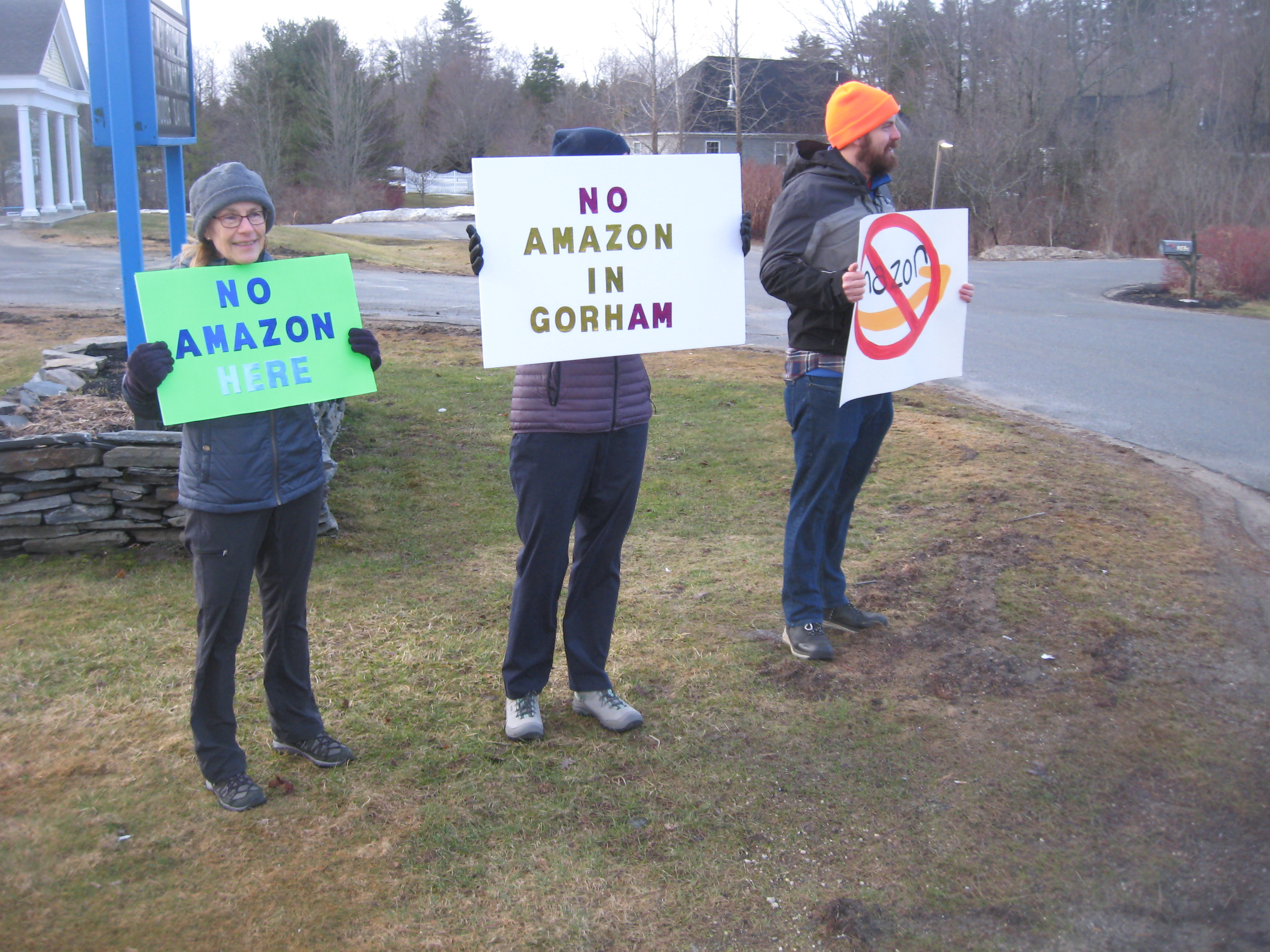 Amazon representatives, on St. Patrick’s Day, reiterated the firm’s plans for Gorham, drumming up support in a community forum held at a credit union, while protesters outside waved signs.