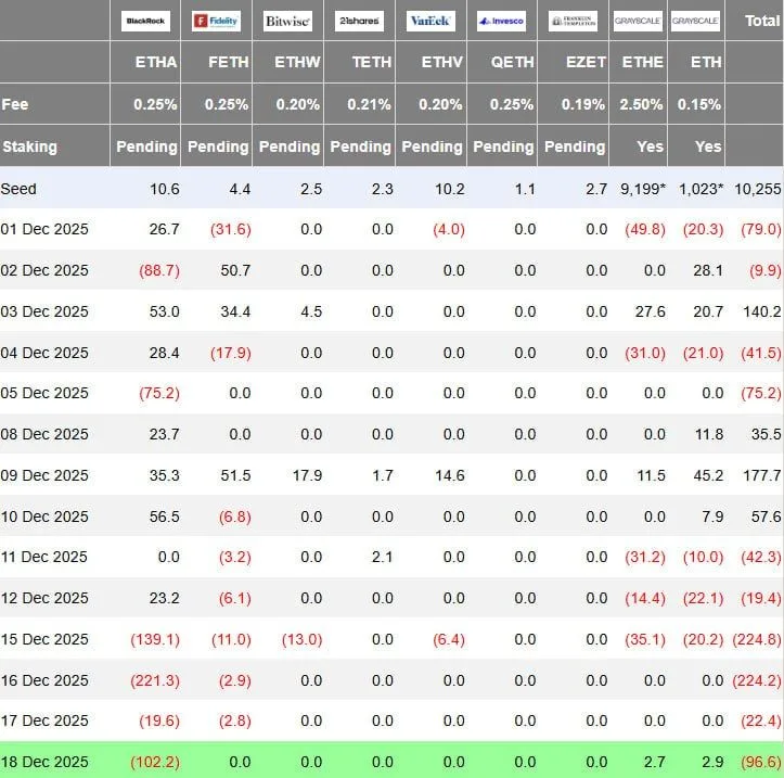 The data reflects a continuation of uneven investor demand for Ethereum ETFs in December. While some sessions earlier in the month saw modest inflows, recent days have leaned negative, pointing to cautious positioning among institutional participants as flows remain sensitive to broader market conditions and short term price action.
