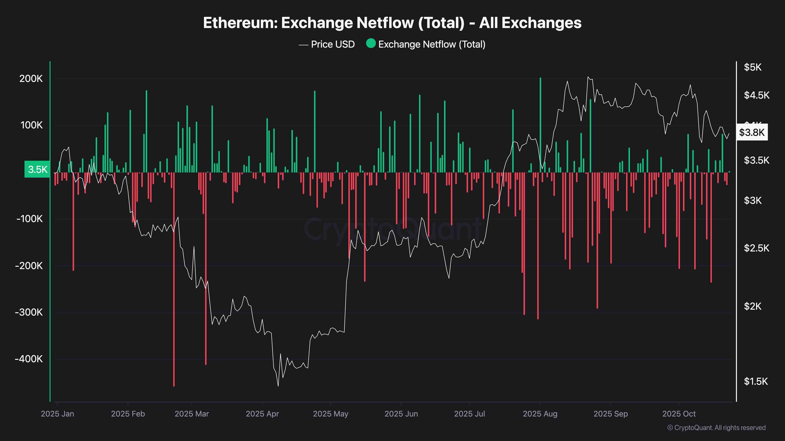 Ethereum’s netflow data paints a cautious picture. The majority of days over the last few weeks have shown strong outflows from exchanges, suggesting holders prefer to keep ETH in private wallets rather than preparing to sell.