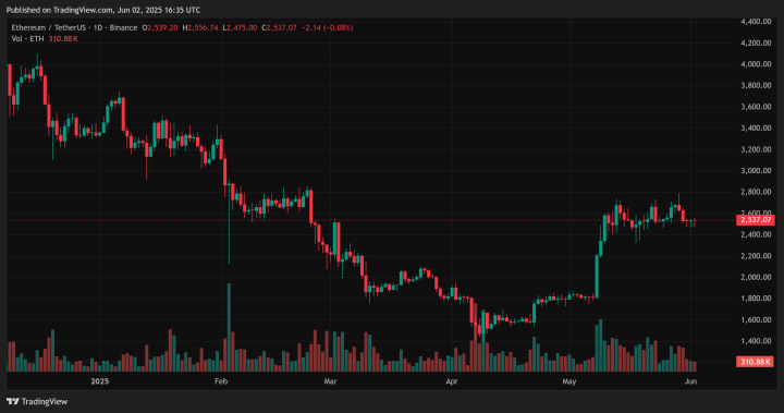 On May 30, 2025, Ethereum (ETH) experienced a notable 4% decline, dipping to $2,630. Despite this pullback, ETH has shown resilience, trading around $2,538.84 as of June 2, 2025.