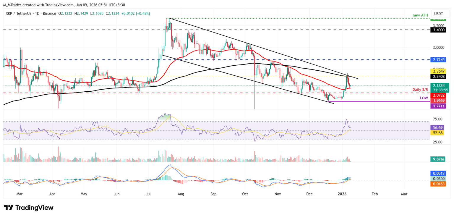 XRP price rejected the upper trendline of a falling wedge pattern on Tuesday and declined nearly 10%, resting at the 50-day EMA at $2.07 on Thursday. As of Friday, XRP trades above this support zone at around $2.13.