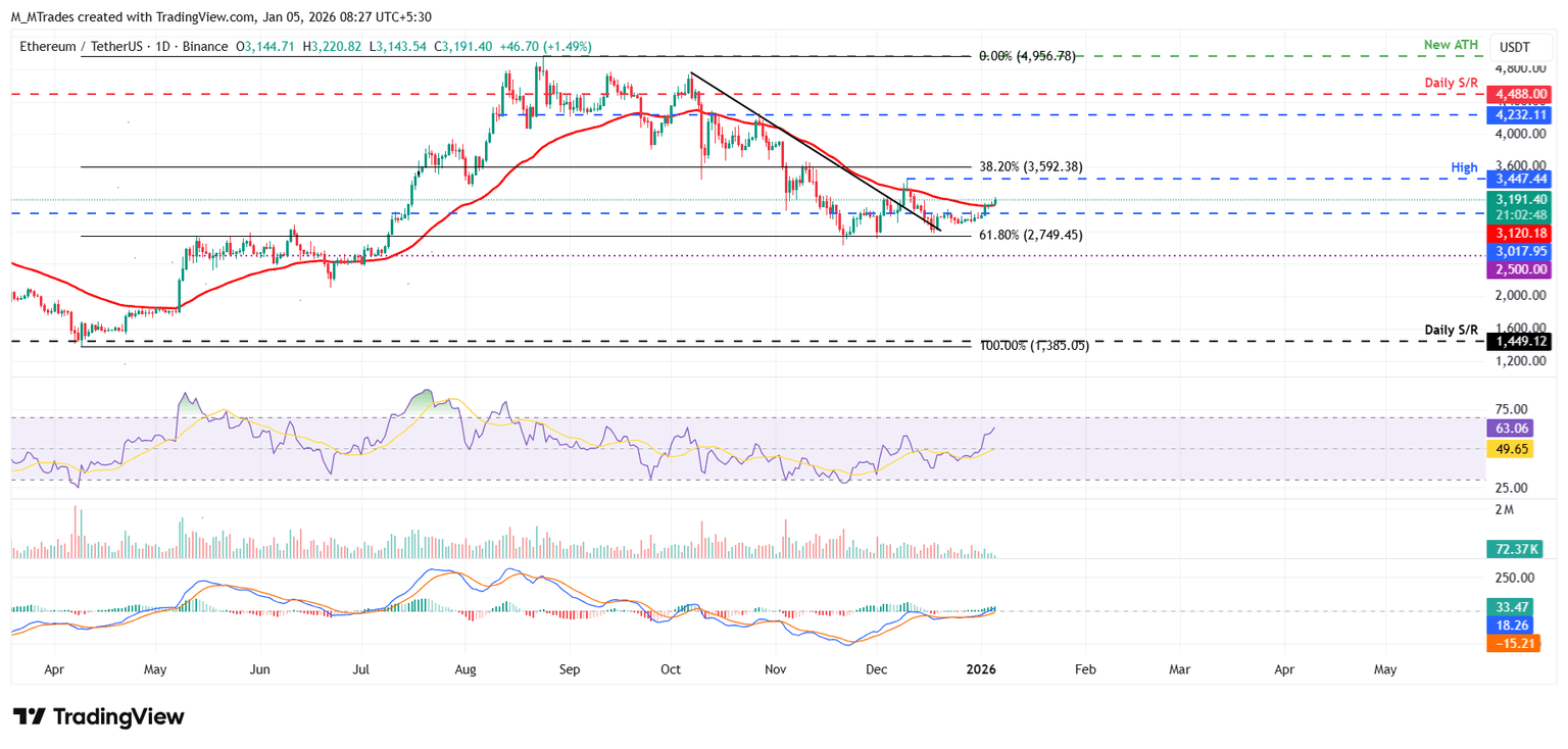 Ethereum price closed above the daily resistance level at $3,017 on Friday and rose slightly, closing above the 50-day Exponential Moving Average (EMA) at $3,120 on Sunday. As of Monday, ETH is trading above $3,190.