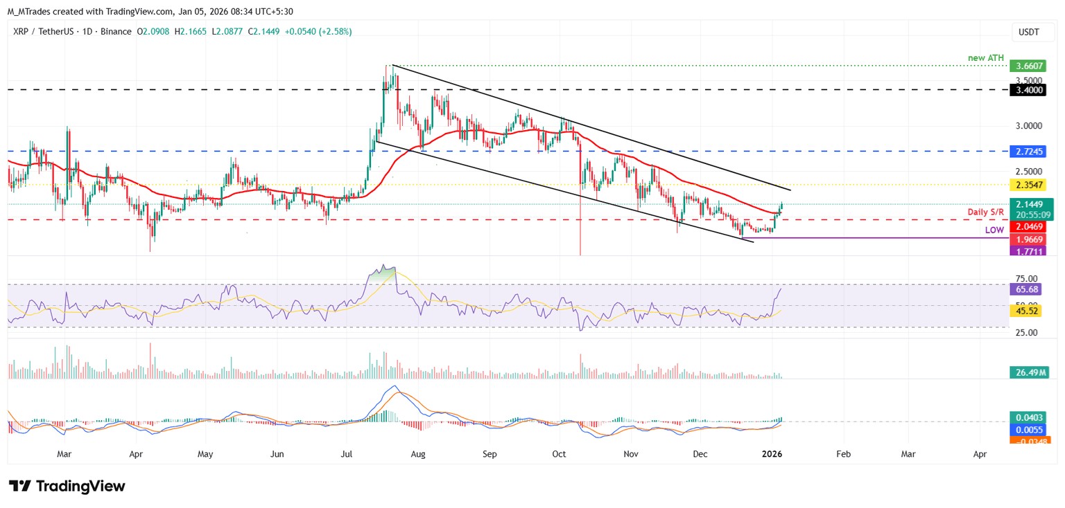 XRP price rose nearly 7% on Friday and closed above the daily resistance level at $1.96. It continued to gain over the next two days, surpassing the 50-day EMA at $2.04. At the time of writing on Monday, XRP is trading above $2.14.