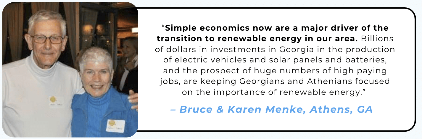 Athens residents Bruce and his wife Karen are encouraged by the strength and resilience of communities like theirs. Bruce says that as the current federal administration is “incredibly, actively engaged in dismantling efforts at the federal level to transition to renewable energy and is even attempting to increase the use of carbon-emitting fossil fuels, this makes the strong local support of climate action in our community more important than ever.”